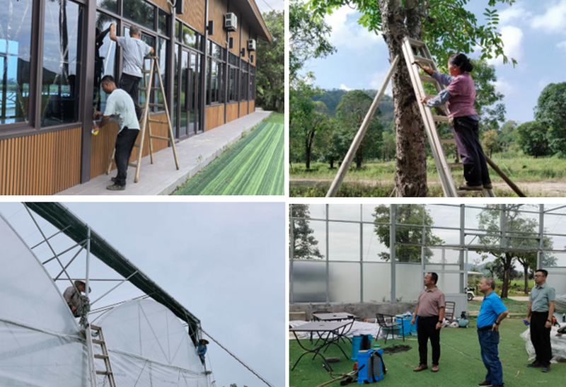 绿怡居公司对生态园内温室大棚、育苗棚等核心设施进行全面检查,加固钢架结构、收紧棚膜固定绳、加装防风压膜带等方式提升抗风能力;对园区内灌溉管道、配电箱、监控设备等基础设施,进行包裹防护或临时拆除转移,避免强风导致设施损坏或漏电风险。提前组织生态园内作业人员开展台风防御安全培训,明确避险流程与应急联络方式,有序撤离园内所有作业人员,关闭园区出入口,禁止无关人员进入,安排专人 24 小时值班值守,密切关注台风动态与园区情况,及时上报突发险情。