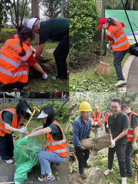 台风过境后,各小区内断枝散落、杂物堆积,环境一片狼藉,居民正常生活与辖区运转均受影响。为尽快扭转这一局面,世荣兆业迅速行动:由公司7名经营班子成员分头带队,联合从公司总部抽调的70 余名员工,共同组建起7支 “复产支援服务队”,第一时间紧急奔赴各物业项目开展支援。