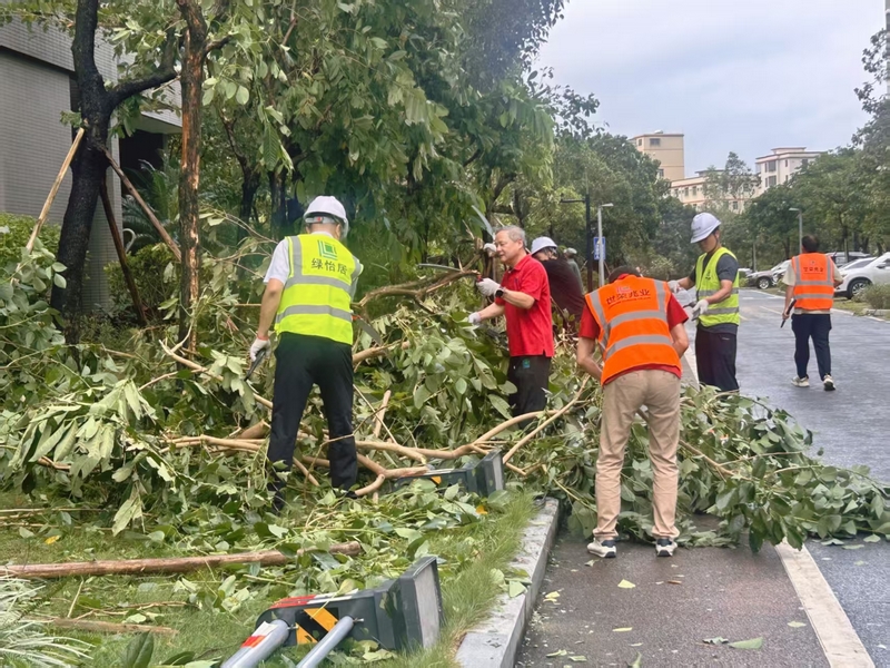 9月25日,由世荣兆业经营班子牵头,总部职能部门迅速响应,抽调70余名员工组成7支复产支援服务队,奔赴各物业项目投入清障一线。身着统一T恤与醒目马甲,他们成为台风过后园区中最亮眼的“流动旗帜”。